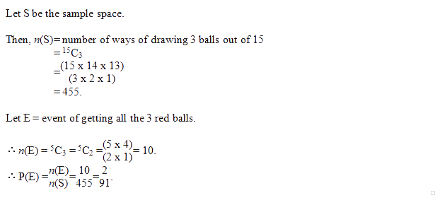 02. A bag contains 4 white, 5 red and 6 blue balls. Three balls are drawn at random from the bag. The probability that all of them are red, is: