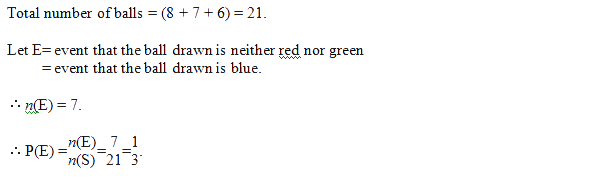 04. In a box, there are 8 red, 7 blue and 6 green balls. One ball is picked up randomly. What is the probability that it is neither red nor green?