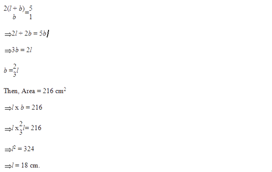 09. The ratio between the perimeter and the breadth of a rectangle is 5 : 1. If the area of the rectangle is 216 sq. cm, what is the length of the rectangle?