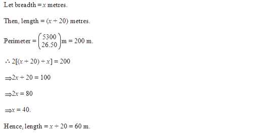 04. The length of a rectangular plot is 20 metres more than its breadth. If the cost of fencing the plot @ 26.50 per metre is Rs. 5300, what is the length of the plot in metres?