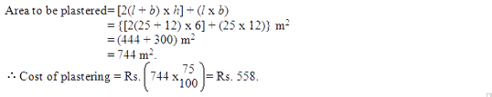 05. A tank is 25 m long, 12 m wide and 6 m deep. The cost of plastering its walls and bottom at 75 paise per sq. m, is:
