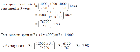 03. A car owner buys petrol at Rs.7.50, Rs. 8 and Rs. 8.50 per litre for three successive years. What approximately is the average cost per litre of petrol if he spends Rs. 4000 each year?