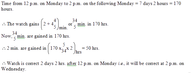 08. A watch which gains uniformly is 2 minutes low at noon on Monday and is 4 min. 48 sec fast at 2 p.m. on the following Monday. When was it correct?
